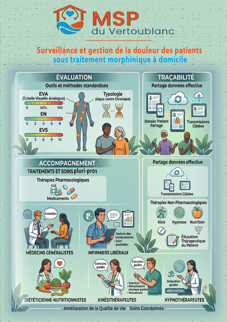 Le protocole pluriprofessionnel (PPP) « Surveillance et gestion de la douleur des patients sous traitement morphinique à domicile » a été élaboré et validé collectivement par les professionnels de la MSP Vertoublanc le 12 mars 2026. Il s’inscrit dans les catégories éligibles à l’Accord Conventionnel Interprofessionnel (ACI), au titre des patients pour lesquels le risque iatrogène ou l’équilibre thérapeutique nécessitent l’intervention concertée récurrente de plusieurs acteurs.